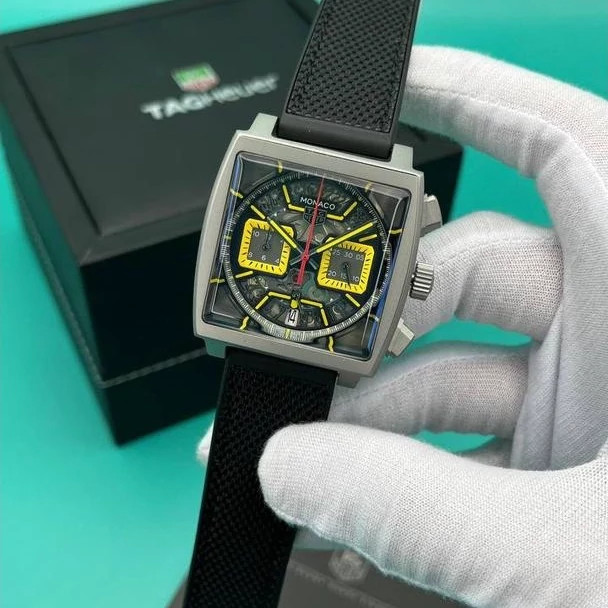 ساعت تگ هویر موناکو نقره ای مات بند رابر زرد سبز