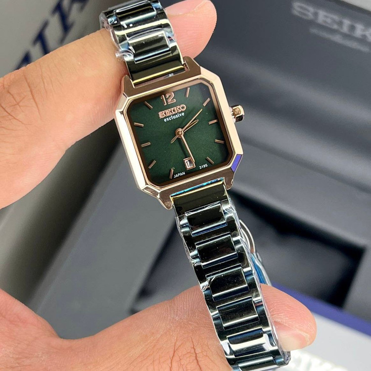 ساعت سیکو زنانه SEIKO EXCLUSIVE مربع سبز تیره فلزی نقره ای قاب رزگلد