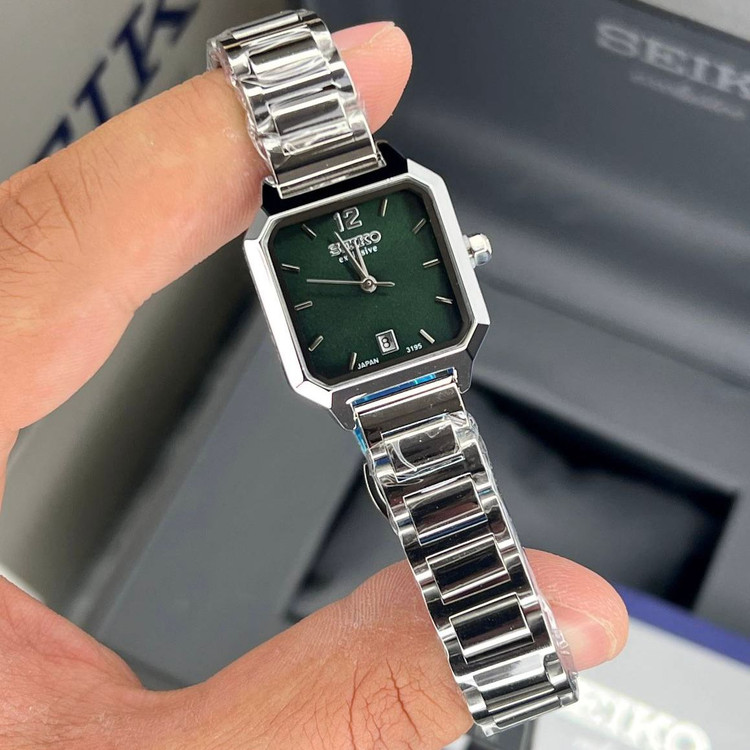 ساعت سیکو زنانه SEIKO EXCLUSIVE مربع سبز تیره فلزی نقره ای