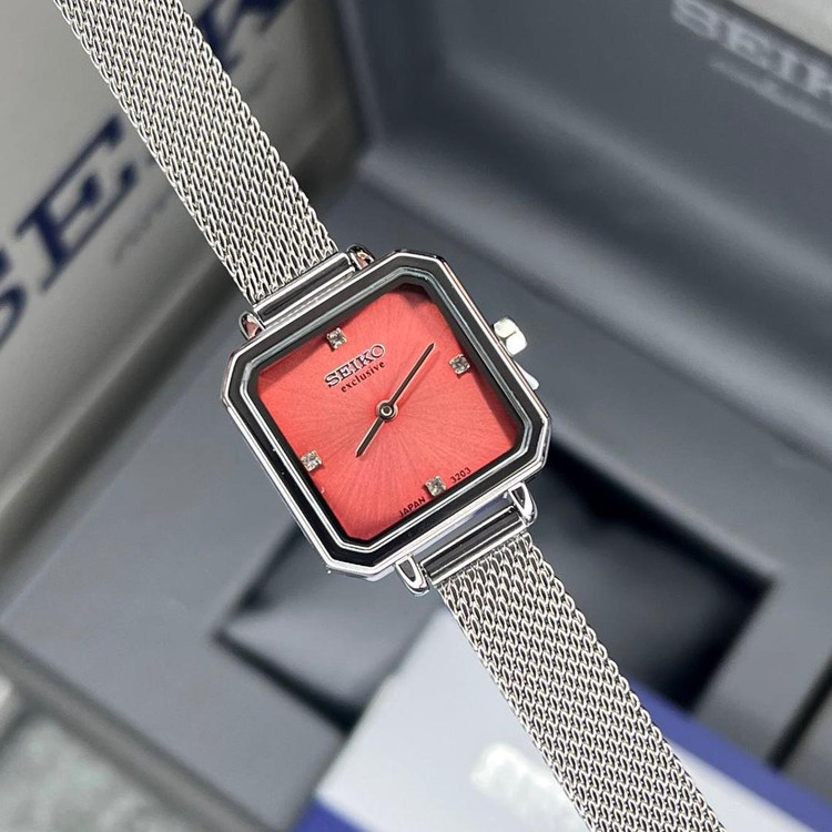 ساعت سیکو زنانه SEIKO EXCLUSIVE مربع صورتی تیره حصیری نقره ای