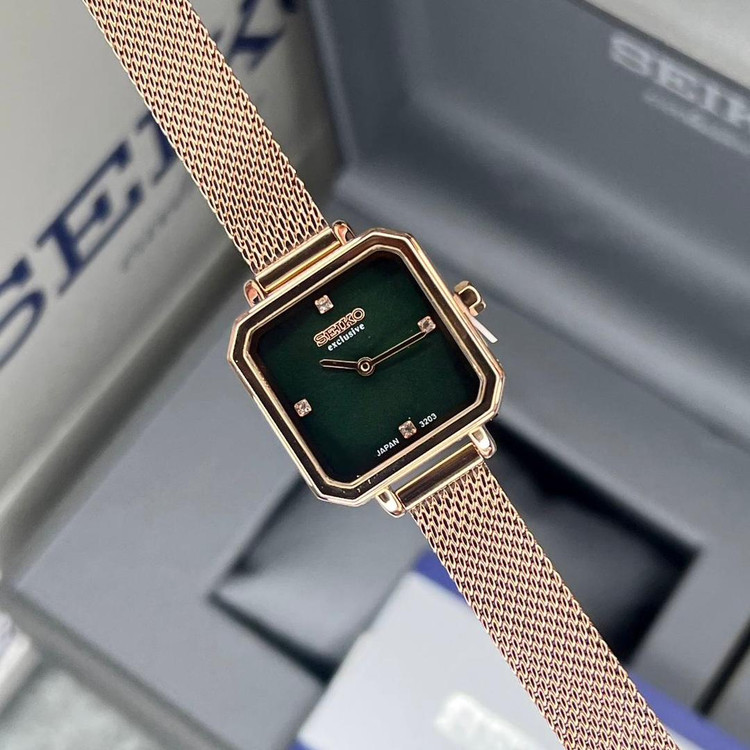 ساعت سیکو زنانه SEIKO EXCLUSIVE مربع سبز تیره حصیری رزگلد