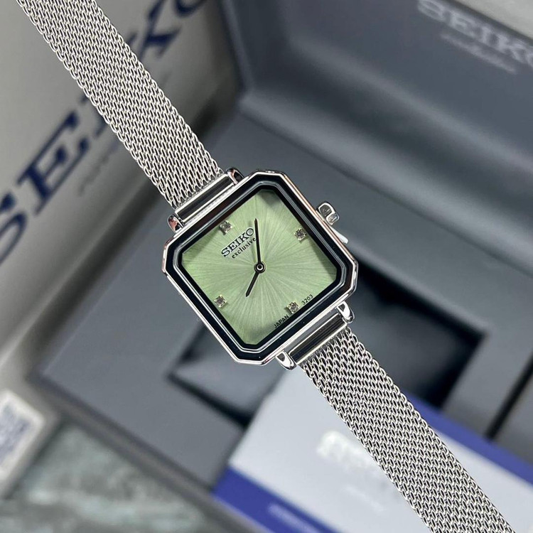 ساعت سیکو زنانه SEIKO EXCLUSIVE مربع سبز روشن حصیری نقره ای