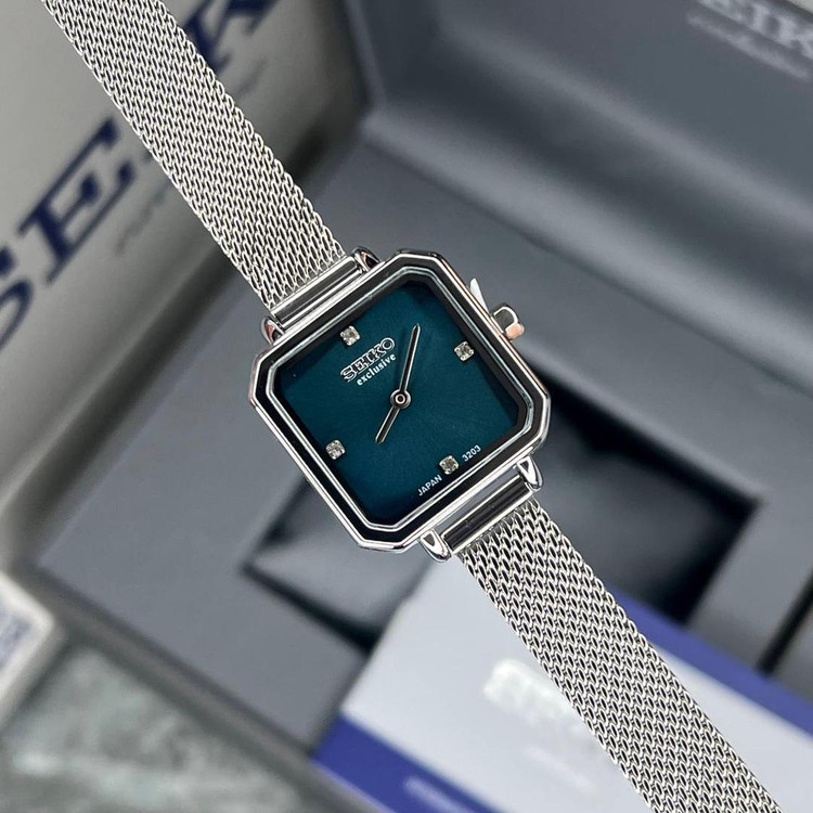 ساعت سیکو زنانه SEIKO EXCLUSIVE مربع سبز کله غازی حصیری نقره ای