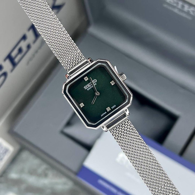 ساعت سیکو زنانه SEIKO EXCLUSIVE مربع سبز تیره حصیری نقره ای