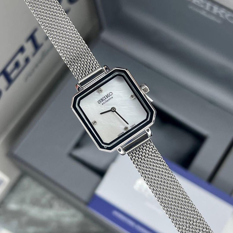 ساعت سیکو زنانه SEIKO EXCLUSIVE مربع سفید حصیری نقره ای