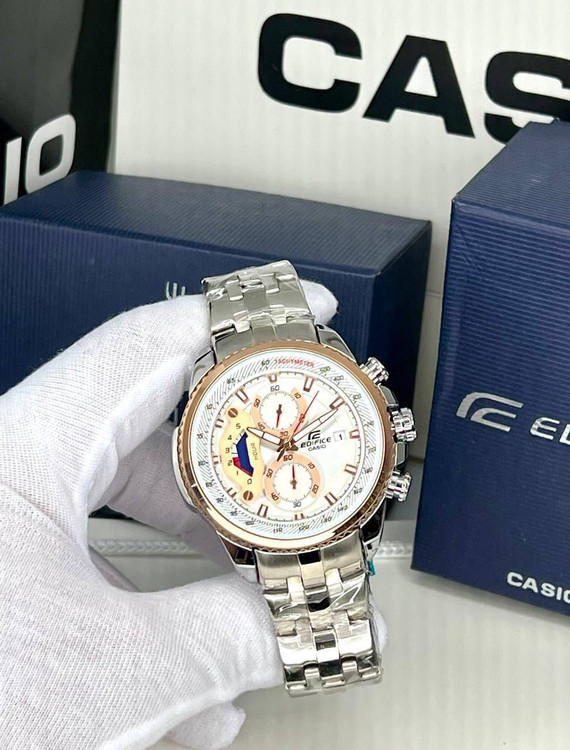 ساعت مردانه کاسیو ادیفایس سه موتور تایوانی سفید رزگلد نقره ای