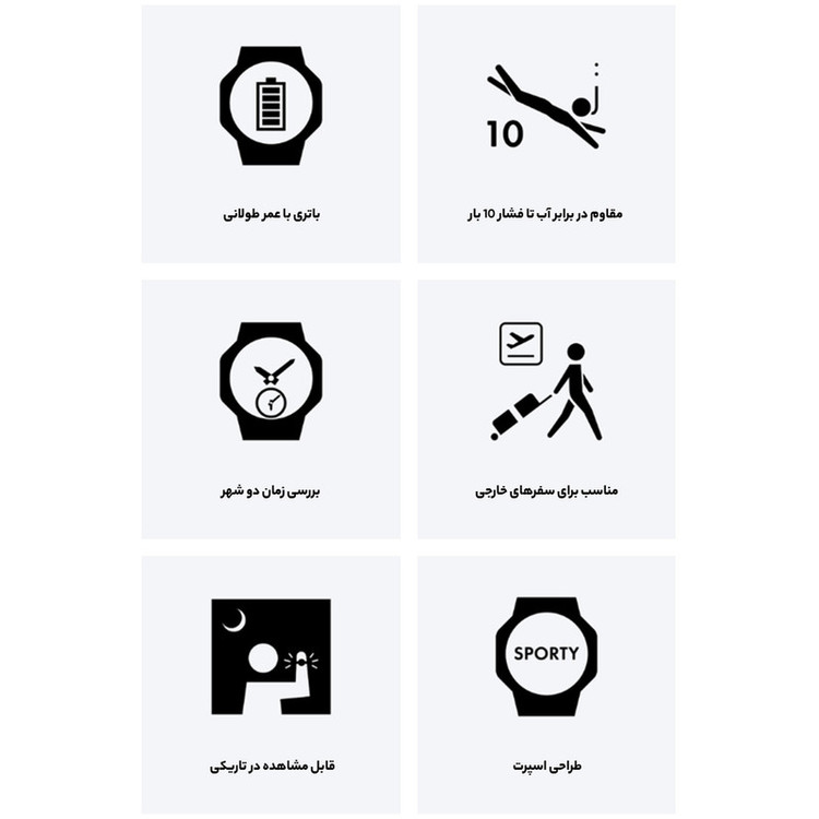 نمایش 24 ساعته , نمایش ساعت دوم , تاریخشمار , نور پسزمینه , آلارم , کرنوگراف , ضدآب