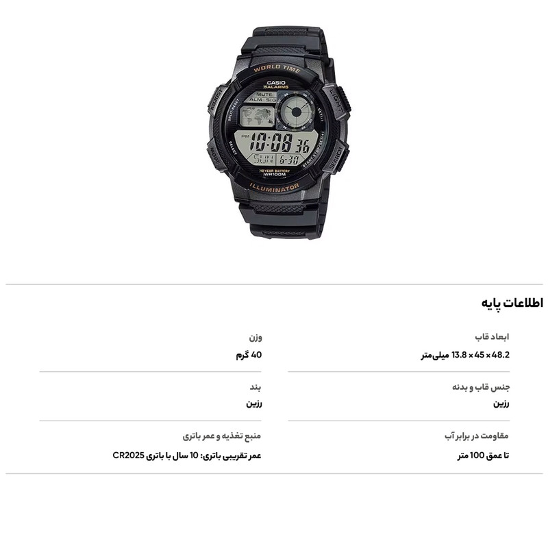 نمایش 24 ساعته , نمایش ساعت دوم , تاریخشمار , نور پسزمینه , آلارم , کرنوگراف , ضدآب